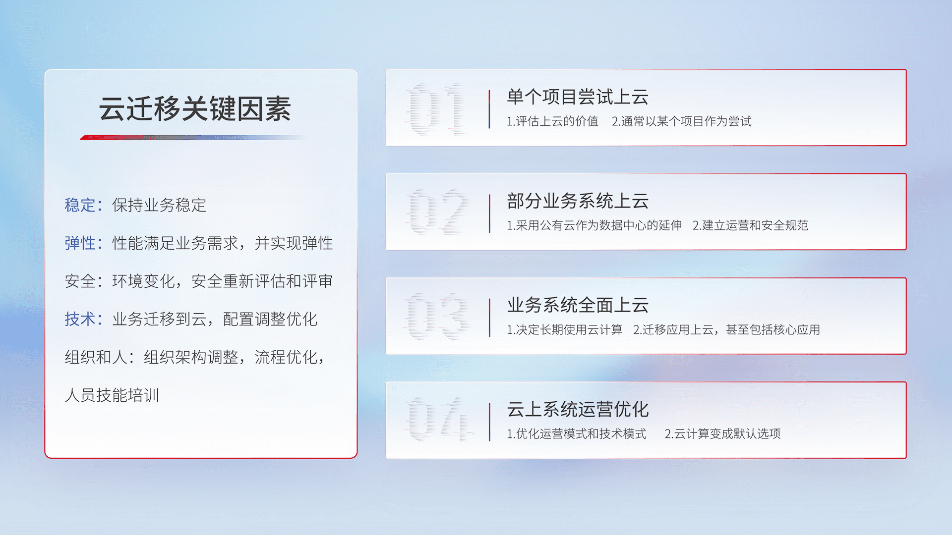 结合实际业务,,,,从规划设计、、、云平台选型、、、云原生改造、、、、数据迁移、、集成交付,,,迁移全过程为客户识别最佳上云路径,,,,做好风险识别管理,,,,设计网络架构、、、、身份权限、、安全审计合规、、、操作审计、、、日志审计、、、监控告警策略、、多站点容灾设计等,,,对云上基础设施进行整体规划,,,,提升IT治理水平,,以满足弹性、、、高可用、、、、高性能的需求。。。